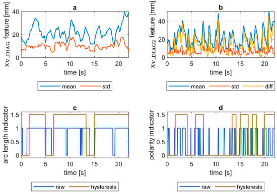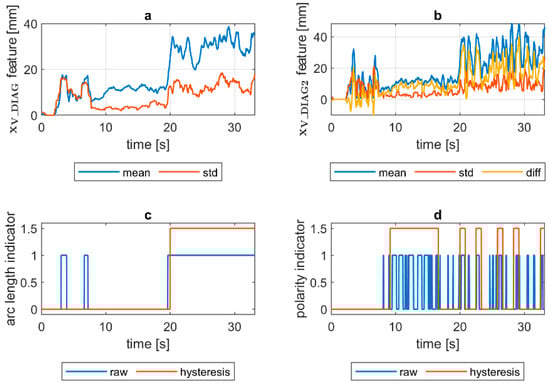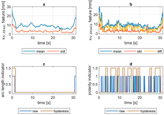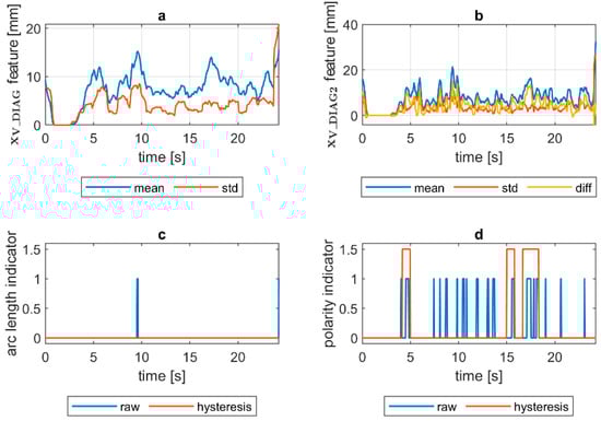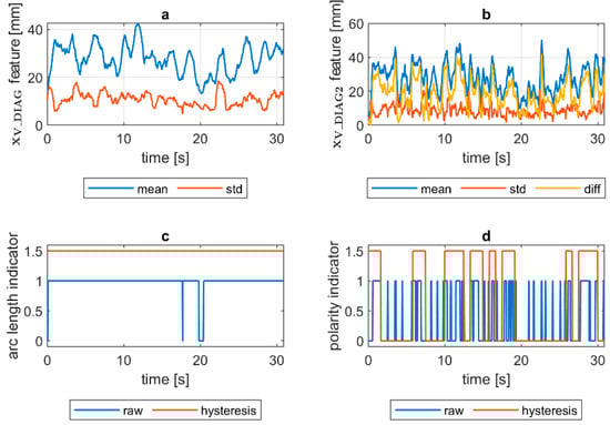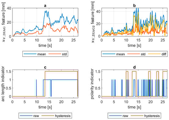 VIS CAM arc length ROI features for DC(−) long arc length process: (a) Sliding window mean and sliding windows standard deviation calculated for window length samples; (b) sliding window mean and sliding windows standard deviation calculated for window length ∆n = 10 samples and difference among them ; (c) Welding arc length indicator () as a raw value and with a hysteresis lasting 30 response delays (samples); (d) Polarity indicator () as a raw value and with a hysteresis lasting 30 response delays (samples).