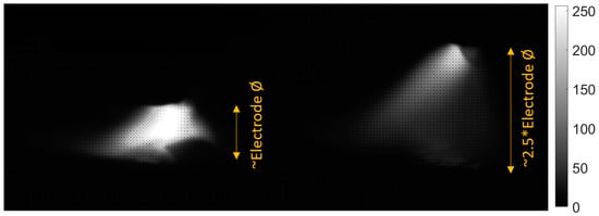 To ease the results’ implementation, VIS camera calibration was made in order to recalculate pixel size-based images to the real-life units. Taking into consideration camera parameters (resolution, pixel size on the camera matrix PS = 3.45 µm, focal length of the lens FL = 25 mm) and the working distance—the distance from the front of the lens to the electrode tip, WB = 500 mm—the field of view (FOV) and the pixel size in millimeters were calculated. The obtained results were: HFOV = 141.31 mm, VFOV = 105.98 mm, and IFOV = 0.069 mm.