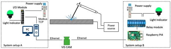 End-user weld monitoring systems setups, with the PC as a central unit (setup A) and a low-cost portable design with Raspberry Pi4 (setup B).