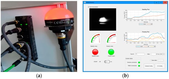 (a) View of I/O module—Turck TBEN TBEN-S2-2COM-4DXP, Turck GmbH & Co. KG, Mulheim, Germany, and indicating light Banner K50LGRYPQ; (b) screenshot of System A GUI, made in Matlab App Designer.