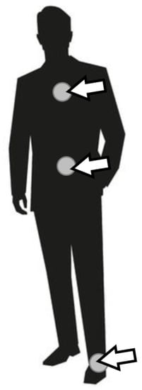 The prototype of wearable sensor network used for the experiments was built of four sensor nodes. Each node contains an ARM microcontroller (STM32F103C8T6) and communication module based on ZigBee technology (xBee S2C). Three of them are additionally equipped with the accelerometer (MPU-9250) and the light sensor (ALS-PT19). These sensor nodes are used as the wearable devices attached to a person, as shown in Figure 3. The fourth node acts as the sink and collects the information about recognized activities of the monitored person.