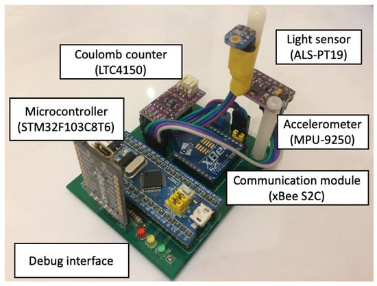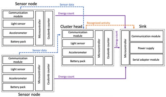 The prototype of single wireless sensor node with connected Coulomb counter is presented in Figure 4. Block diagram of the testbed used in experiments with wireless wearable sensor network was shown on Figure 5. At the training stage, all data readings of accelerometers and light sensors were preprocessed by the sensor nodes (as explained later in this section), collected by the sink, and transferred to a workstation. In this way the sample data set was gathered for training the classification and recognition models. The models were trained on the workstation with use of Waikato Environment for Knowledge Analysis (WEKA package) and Konstanz Information Miner (KNIME) software []. The KNIME allows us to use both KNIME machine learning implementations and the WEKA repository that gives over 100 various methods and their variants. It proved to be useful in data exploration and finding machine learning solutions in previous works. For a small number of sensor nodes, the experiments could be conducted in a reasonable time using KNIME. For larger networks, Python or MATLAB would be more useful. The KNIME workflow containing the data set is available at http://biometrics.us.edu.pl/request/database/activity. Based on initial experiments, the random forest algorithm was selected. This algorithm, together with the trained models, was deployed on the sensor nodes.