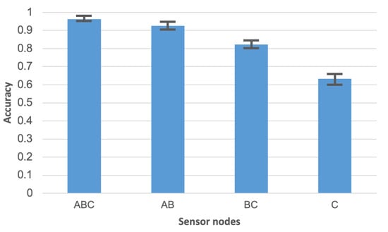 The number of all possible sub-models equals to . Thus, this number increases fast with the number of sensor nodes (n). However, the considered wearable sensor networks for human activity monitoring consist of only few sensor nodes [] and in this case the above model ensemble can be easily implemented (e.g., for the number of all sub-models equals 7). In order to recognize human activity, during operation of the sensor network, the cluster head selects appropriate sub-model , where Z corresponds to the set of senor nodes that currently deliver data readings. It should be noted that the cluster head node always has the access to its own sensor readings. Thus, if is the identifier of cluster head then the ensemble model needs to include sub-models , where . This observation allows us to reduce the number of sub-models that have to be stored by the sensor node , as the sub-models , where can be omitted. Thus, the number of necessary sub-models is reduced to , i.e., for we need 4 sub-models.