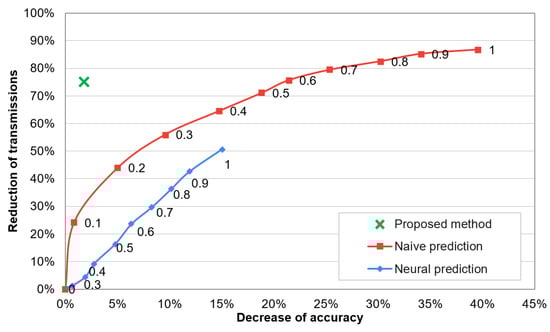 Prediction-based approach enables selective transmission of the data collected by sensor nodes [,,]. According to this approach, only a subset of the collected data is delivered to the sink node. Each sensor node has to decide whether to send its current data readings to the sink. When data are not transmitted, the sink has to reconstruct them. To this end, the same prediction algorithm is used at the sensor node and at the sink for estimation of the current data readings. If the prediction error is above a predetermined threshold then the sensor node sends its data readings to the sink. In opposite situation, the data are not transmitted and the sink uses the prediction as an accurate estimate of the sensed data.