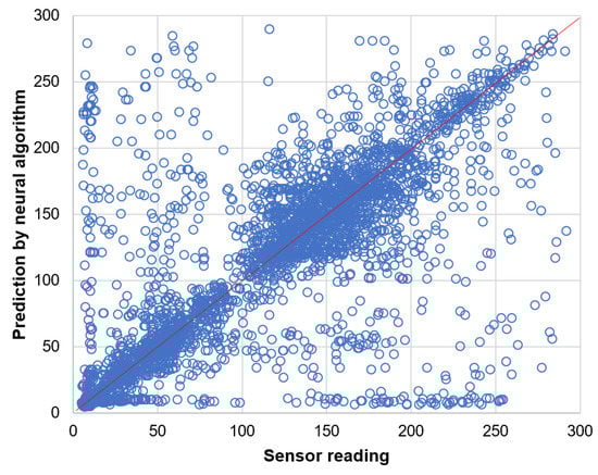 Prediction results for the data readings of light sensor are presented by the scatter plots in Figure 14 and Figure 15. These results clearly show that the naive prediction (Figure 14) is more accurate than the neural network (Figure 15) as the data points in scatter plot for naive prediction are more closely concentrated along the diagonal line.