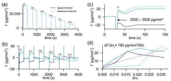 This equation assumes that the refractive index jump is perfectly correlated over one signal and reference region. This is justified since the grating period is only in the order of 350 nm and since equilibration by advection over this length scale happens within a fraction of a second [26]. Diffractometric sensors have a small sensitivity to cover index changes because the molecules/particles on the signal region occupy only a tiny physical volume of the evanescent field. In the experiment, the sensor was slightly biased with polystyrene particles to a coherent mass density of 23.4 pg/mm. If we insert this value and, additionally, for polystyrene particles, in Equation (5), we obtain −69.3 pg/mm/RIU for the sensitivity to cover index changes in water. This is three orders of magnitude less than for the unreferenced refractometric sensor. We plotted this as a function of the applied refractive index discontinuity in Figure 2d together with the experimental values from Figure 2b. One can see that the model and the experimental data agree well. It can thus be concluded that high-frequency spatially locked-in biosensors can almost fully reject refractive index jumps. Furthermore, the readout is only affected because of the molecules already present on the sensor, i.e., the capture molecules. This is a property of any referenced sensor, as we shall see in the next paragraph.