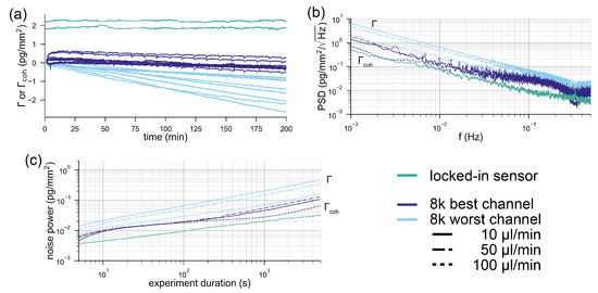 Comparison of the noise performance of a state-of-the-art referenced refractometric biosensor with a spatially locked-in diffractometric sensor: (a) typical baselines of the locked-in diffractometric readout channel (green) extracted from two molographic spots and the response of the best (dark blue) and the worst channel (light blue) from the eight channels of a Biacore 8k+ instrument. The displayed response is the difference between flow cell 1 and flow cell 2 (referenced binding trace). In a Biacore 8k+, each of the eight channels has two flow cells operated in parallel and the referencing between two flow cells is considered crucial in high-performance measurements. In total, nine baselines are shown (three different flow rates and triplicates for each experiment). The unit for the molography traces is the coherent surface mass density, whereas for the Biacore system, it is surface mass density. (b) Power spectral density of the binding traces shown in (a) the average power spectral density of the triplicates for each experiment was computed and displayed. For the diffractometric readout channel, the power spectral density was computed from one trace, since it was almost identical for both traces. (c) Integrated power spectral densities of the surface mass density/coherent surface mass density (noise power picked up by the system) for different experiment durations.