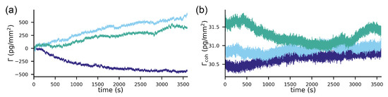 The experiment on the Biacore 8k+ was conducted with the following parameters. The 8k+ instrument was cleaned with the usual maintenance protocols: desorb and sanitize, desorb and superclean. PBS-T pH 7.4 containing 11 mM PO, 137 mM NaCl, 2.7 mM KCl and 0.05% Tween20 was used as the running buffer. A new CM5 chip and a 2.5-month in-place IFC (Integrated Microfluidic Cartridge) were used for the measurements. The running buffer was injected for one minute as the analyte and the dissociation phase was measured for 200 min at 25 C with a data collection rate of 1 Hz. The flow rate was varied to 10, 50 and 100 L/min. The evaluation of the data was performed using Insight SW 3.0.11.15423, and the despiked data were exported. The experiment was aligned to the report point “stability early”. Each experiment was performed in triplicates (three cycles). For evaluation, the best and the worst channels of the eight channels of each experiment were used. For focal molography, the experiment was carried out on a chip fabricated as described in [26,27] with the flow cell described in [27]. The coherent surface mass density was calculated from the outcoupled power. The power at the location of the mologram was 0.045 W/m. The sampling frequency was 1.6 Hz. The diameter of the mologram was 0.4 mm, and the numerical aperture was 0.1. The microscopy objective had a numerical aperture of 0.1 as well. The buffer was filtered and degassed wtih PBS-T (ThermoFisher, 0.05% Tween20 added), and the flow rate was 5 L/min. The molograms were weak SAv molograms (2–2.5 pg/mm).
