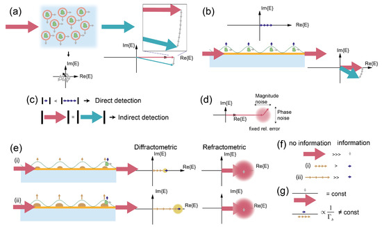 Indirect detection schemes have the advantage that they can provide signal gain if is much smaller than and by making the detection shot noise limited (meaning that dark current, readout noise, etc. can be suppressed). However, this only considers the detection precision of . A reference beam (local oscillator) is never perfectly stable or correlated with the resultant phasor, especially with a longer path difference between reference and signal beams. Thus, any phasor has a relative magnitude and phase uncertainty (Figure 6d) that is proportional to its length. When the signal is already strong enough by itself such that the detection is shot noise limited, it is disadvantageous to have an additional strong reference phasor interfering with a “small” signal phasor. This is because if the reference phasor is not sufficiently stabilized its uncertainty easily masks the small change induced by a biomolecule that binds to the sensor (Figure 6e). This is especially detrimental for amplitude errors because these contribute with the square in Equation (8) whereas the signal (phase) is only linear. Conversely, direct detection does not require a reference phasor and thus also does not need to stabilize it. In addition, the diffracted beam phasor has a zero length for a perfectly smooth surface because the detection is off axis from the main beam. Even if a small bias is present on the diffraction grating, the diffracted phasor is still small compared with the additional phasor when one molecule binds and can easily be detected. However, the larger the bias, the longer the diffracted phasor relative to the scattered phasor of the additional molecule and the harder it will become to detect it.