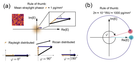 Rules of thumb for the lengths of typical stray light phasors of diffractometric biosensors as well as the refractometric phasors phase change per bound mass: (a) the stray light phasor length for optically smooth surfaces typically corresponds to 1 pg/mm and is Rayleigh distributed. By interference in the far field, all roughness phasors form one random phasor sum with resultant phasors that form a fully developed speckle pattern with a negative exponential distribution of intensity. Thus, even a 10% magnitude error of the phasor results in only a 50 fg/mm mass density error (Equation (10) and the mass density version of Equation (9)). In a direct measurement, the phase angle between stray light (yellow) and the phasor of the bound molecules (violet) is not known. The length of the resultant (black) phasor that is measured therefore follows a Rician distribution, and its length depends on the mutual orientation of stray light and signal phasors. The figure shows the resultant phasor’s length for three different phase angles. This uncertainty can be overcome by measuring the phase angle between the stray light phasor and the signal phasor by a phase reference (indirect technique). (b) In good refractometric biosensors, roughly 1000 pg/mm corresponds to a phase change of 2. Thus, a measurement error of 10% will give rise to a 100 pg/mm error in terms of mass density.