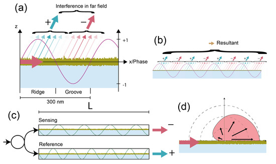Diffractometric biosensors as off-angle local common path vs. refractometric interferometers: (a) diffractometric biosensors are a nearly perfectly balanced off-angle local common path interferometer. Oscillation of the phase of the electromagnetic field defines regions of constructive and destructive interference for a given diffraction condition. Therefore, the contribution to the resultant phasor varies sinusoidally over one grating period, whereas the edges of the ridges and grooves hardly contribute. (b) In the farfield, the contribution of all reference and signal regions is added up interferometrically to one resultant phasor. (c) In interferometric refractometric biosensors, the phase change is linked to different optical path lengths rather than defined by oscillation of the electromagnetic field. For this, the beam needs to be splitted, which introduces noise. (d) Scattering on the surface of a waveguide is anisotropic since the roughness power spectral density is typically Lorenzian [27]. This higher noise at lower spatial frequencies leads to predominant forward scattering and hence to worse stray light interferences in interferometric refractometric than diffractometric biosensors.