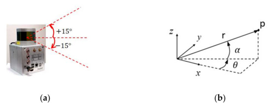 Each laser frame acquired by the Velodyne VLP-16 scanner can be arranged according to 1800 horizontal points and 16 vertical points, which are described in the spherical coordinate system (as shown in Figure 1). Each target data point is expressed as , where r is the distance from the target point to the center of the sensor, is the pitch angle of the laser beam and is the azimuth angle of the laser beam. A range image with 1800 × 16 points was formed, which is expressed as . The transform from the spherical coordinate system to the rectangular coordinate system is as follows: