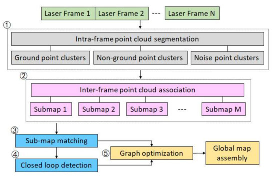 As shown in Figure 4, the first layer is where 3D point clouds are aligned between consecutive frames, which is called the interframe association layer. Several papers [,] used the ICP algorithm to align the point clouds. However, if the point cloud of each frame is sparse, and it is difficult to find adequate matching features, the ICP algorithm will easily lead to false results being trapped in the local optimum. Therefore, this study applied the NDT algorithm to match the point clouds between consecutive frames, and form the submaps including n frames. In this study, the sampling rate of the ASQWolf system was 10 Hz, i.e., 10 laser frames were obtained in one second, thus, it is reasonable to consider that there was no cumulative error in the submap.