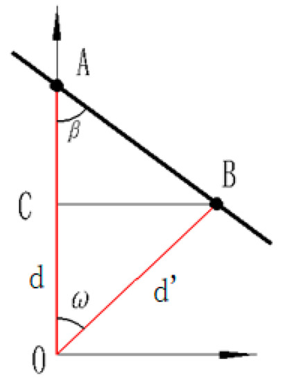 The range image segmentation principle of this method [] is shown in Figure 3. is the angle of the adjacent scan lines, the angle in VLP-16 = 0.2°, OA and OB are the laser beams, A and B are two arbitrary points measured from the scanner, the angle is the angle between the AB line and the laser beam OA. The angle can be calculated based on the two distances from the center of the sensor to the measured points (A and B). The distance from the sensor center O to the target point A can be represented by , that is . The distance from the sensor center O to the target point B is represented by , that is , the anglecan be expressed as:
