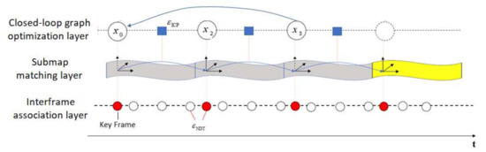 Framework of the three-layer point cloud association technique. In the interframe association layer, the red points represent key frames; in the submap matching layer, the grey submaps denote that they have been matched, the yellow submaps are waiting for matching and in closed-loop graph optimization layer, denotes the pose of the i-th key frame.
