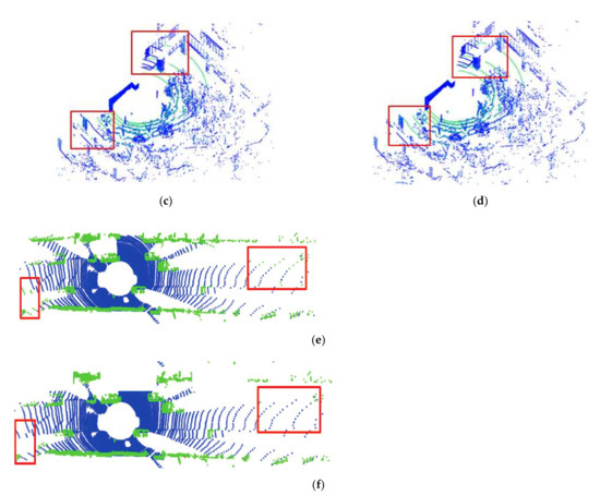 In Figure 7, there are two point clouds of the adjacent frames, which are marked separately in blue and green. They were aligned by using the ICP algorithm, the FPFH algorithm, the Super-4PCS algorithm and the NDT algorithm, and the registration results are shown from Figure 7a–d, respectively. The translation errors, rotation errors and computing time of the point cloud registration are listed in Table 3.
