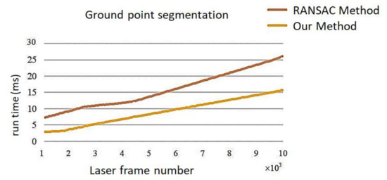 Secondly, we compared the speed of the ground segmentation between the traditional RANSAC algorithm and the improved RANSAC algorithm. The comparison results are shown in Figure 6, where the x-axis is the point number of the point cloud segmented by the two methods, and the y-axis is the segmentation time. It shows that the speed of the ground segmentation using the improved RANSAC algorithm is faster that that using the traditional RANSAC algorithm.
