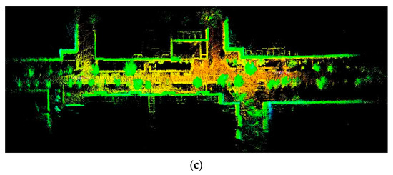 The 3D point cloud map reconstructed by three different algorithms. (a) The 3D point cloud map is constructed by our algorithm; (b) the result is obtained by the traditional optimization algorithm with interframe alignment and closed-loop optimization and (c) the result is obtained by the algorithm with interframe point cloud association and subgraph association.