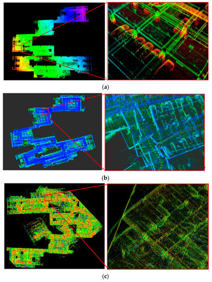 Figure 9 shows the 3D point cloud maps reconstructed by three different algorithms. From Figure 9a, the structured feature edges in the 3D point cloud map constructed by our algorithm were very clear, without ghosting, and the angle features and the straight-line features were kept. Where the NDT algorithm was only applied to match the consecutive frames, and the ICP algorithm was applied to match the submaps. In Figure 9b, the result was obtained only by a traditional optimization algorithm with interframe alignment and closed-loop optimization and without submap match, the structural features in the environment were not clear, positioning deviation occurs to leading to the generation of point cloud ghosting in the map. Where the NDT algorithm was only applied to match the consecutive frames. Figure 9c was the result of only interframe point cloud association and submap association without closed-loop optimization. Not only the structural features in the environment were not clear, but also due to the large cumulative error, the 3D point cloud map could not be built.