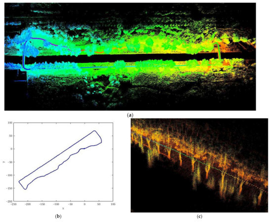 In order to determine the number of laser frames contained in each submap, several experiments were designed and conducted. In the first experiment, the NDT algorithm was applied to match the point clouds between consecutive frames, but the ICP algorithm was not used to associate the submaps when each submap included only one laser frame. The experiment result was shown in Figure 8a, some misalignments appeared in the 3D point cloud map. In the second experiment, each submap included three laser frames, the point clouds between consecutive frames were aligned by using the NDT algorithm, and the key frames between consecutive submaps were matched by using the ICP algorithm. However, there were some misalignments in the 3D point cloud map (Figure 8b). In the third experiment, each submap included five laser frames, there were few misalignments in the 3D point cloud map (Figure 8c). In the fourth experiments, a line segment was selected as shown in Figure 8c, the relative errors were computed between the measurements from the 3D point cloud map constructed by the different submaps with n (n is from 1 to 6) frames and the truth value, and then the relative errors are shown in Table 4.