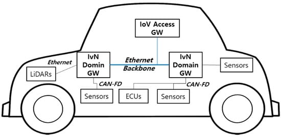 As IVN communication technology, various technologies have been applied according to the type of data traffic in the vehicle. These include the local interconnect network (LIN), controller area network (CAN), CAN-flexible data rate (CAN-FD), media-oriented system transport (MOST), FlexRay, and Ethernet. LIN provides very low-speed data (20 Kbps) communication. LIN is composed of a master and slaves and is used for communication to control elements of the vehicle body such as the glass, doors, wipers, etc. CAN provides conventional in-vehicle communication between sensors and ECUs for powertrain. CAN provides low bandwidth (1 Mbps) for communication. Because of this bandwidth limitation, CAN-FD is proposed. CAN-FD expands the size of transmitted data and improves the bandwidth. FlexRay is a bus system with high-speed (10 Mbps) communication. FlexRay is used for the safety controls in a vehicle. Both MOST and Ethernet are communication technologies that transmit multimedia or infotainment traffic in vehicles over a high bandwidth [4,5,6,7,8,9,10,11,12]. Recently, the use of Ethernet is expanding to handle large amounts of autonomous driving traffic at a high speed. Ethernet backbone is required for high-speed processing of data generated in each functional domain of a vehicle.