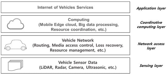 In IoV environments, vehicles, road side units, and pedestrians become nodes to join a wireless network. They are connected in a mesh network topology and construct V2X communication networks using various wireless access technologies. As a vehicle connected network, IoV is similar to the Internet of Things (IoT). However, in IoV, the interaction between the nodes (i.e., vehicles) and the users is more important than in IoT. The interaction is reflected in the IoV system architecture. The IoV system architecture is composed of sensing, network access, coordinative computing, and application [20]. In the sensing layer, vehicles sense on-board data from vehicle devices and road side units (RSUs) measure on-road data. The collected data in the IoV nodes is shared through the network access layer. The coordinative computing layer processes the shared data over the network and handles interactions between vehicles and users. Various types of applications are served in the application layer. Figure 2 represents the IoT system architecture.