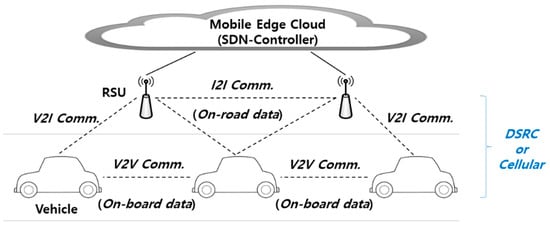 For IoV networks, there are two types of communication technology: Dedicated short range communication (DSRC) and Cellular. DSRC provides high-speed transmission based on IEEE 802.11, but contrary to Cellular, has difficulty guaranteeing stable connectivity. Cellular provides reliable connectivity and high mobility, but this comes at a cost. These two communication technologies are complementary for IoV services. In addition, attempts are being made to combine with edge clouds to support service-based computing of IoV. Edge cloud provides several functionalities (i.e., computing, storage, data processing, etc.) to mobile nodes and supports the coordinative computing layer. In addition, network control efficiency can be improved by building a software-defined network (SDN) through the edge cloud [16,20,21,22,23]. Figure 3 represents the IoV network.