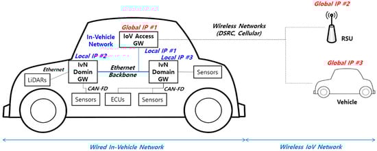 The IoV access gateway (A-GW) is a network gateway that connects the in-vehicle network and the out-of-vehicle network. On-board data generated from in-vehicle devices passes through the IoV access gateway to connect with the IoV network. The IoV access gateway is also used for vehicles to receive on-board data from other vehicles or on-road data from RSUs. For IoV services, a heterogeneous network consisting of IVN and IoV is created through the IoV access gateway. Figure 4 represents the integrated heterogeneous network for IoV services.