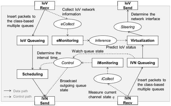 On-board data from in-vehicle sensors received by the IVN Recv state is sent to IoV Send state via IVN Queueing and Virtualization states. In the IVN Queueing state, data packets are queued in multiple class-based queues according to their priority. In the Virtualization state, a scheduled data packet is sent using virtualized IoV network. According to wireless IoV network conditions, a network interface can be switched. For traffic steering in the IoV network, the network condition should be monitored and predicted in the wireless condition. Thus, the proposed IoV A-GW collects the external network information using the eCollect function. In the eMonitoring state, the wireless condition of the external IoV network is monitored. The Inference function predicts the IoV wireless conditions by performing machine learning such as the deep neural network algorithm. Then, according to the external network status, data traffic generated by in-vehicle sensors and flowing into the IoV network can be steered. The IoV network is virtualized, and data packets are delivered to the IoV through the virtualized network. The Steering function controls IoV network interfaces through the inference results. Then, data traffic can be transmitted without consideration of IoV network selection. That is, data traffic is delivered to virtualized IoV network and IoV network selection is performed by the Steering function.