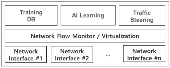 In addition, the optimal state of a wireless network can be known through machine learning. In general, wireless network state changes frequently and is highly affected by noise or interference. Thus, it is necessary to be aware of the network condition and then attempt to transmit data. To do this, network condition inference using machine learning is performed. The IoV A-GW collects information from IoV networks in the eMonitoring state shown in Figure 5. The information is used as training data to infer such network conditions as link quality or congestion. Several algorithms can be used for the training: logistic regression, Bayesian classifier, SVM, deep neural network, etc. As a result of machine learning, the state of wireless conditions of IoV can be predicted [30,31,32,33]. In the proposed method, the deep neural network model for network status prediction of our previous work [33] can be applied. The deep neural network model is composed of 1 input with 2 nodes, 8 hidden layers with 30 nodes and 1 output with 1 node [33]. As the input data, network throughput and received signal strength can be used. If the wireless network is selected according to the predicted value in the Virtualization state, the IoV transmission efficiency can be increased. The traffic control architecture using machine learning is as shown in Figure 6.