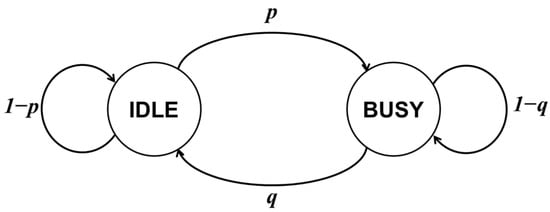 The IVN Ethernet backbone is modeled by two-state Markov chain [35] with an idle and a busy state, as shown in Figure 7. In the busy state, because the backbone channel is used, data cannot be transmitted. In the idle state, the channel is not used, and thus data transmission is attempted after carrier sensing. At this time, the probability of packet loss due to collision is assumed to be 1%. The Markov chain is a probabilistic model in which state transition occurs according to given probability. The transition probability p from the idle state to the busy state is set to 0.4, 0.5, and 0.6. The transition probability q from the busy state to the idle state is set to 0.7. In addition, it is assumed that the state transition of the backbone channel occurs every 5 msec.