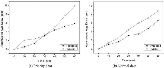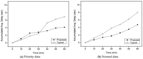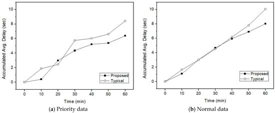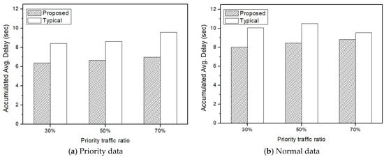 Figure 12 shows the overall simulation results according to IoV high-priority ratio. Even if priority traffic increases, transmission delay in the proposed method is reduced in both high-priority and normal traffic. In particular, the proposed method shows better performance in processing high-priority traffic than normal traffic when the proportion of high-priority traffic in a vehicle network is large.