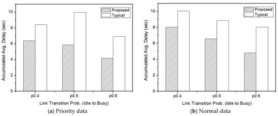 Figure 11 shows the overall simulation results according to the transition probability p. As shown in Figure 8, Figure 9 and Figure 10, there is a difference in transmission delay of 2 s or more between the proposed method and the existing method. As the link transition probability from the idle state to the busy state increases, the overall transmission delay is slightly reduced. It is shown that the actual transmission amount has decreased due to the decrease in the idle state for data transmission, and thus the total accumulated transmission delay for the simulation time is reduced.