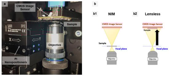A key improvement of this setup, following the results of [39], was the ability to locate the sample precisely where the spot was of minimum size, by placing it at the focal plane of the lens (see Figure 2b1). As the spot size, as well as the pitch, is critical for image formation, this allows for improved resolutions. Additionally, samples that present an inhomogeneous surface can be explored by scanning them at different height levels. Therefore, more information is compiled from the scanned sample due to the in-focus and out-of-focus areas. An additional strength of this microscope was the flexibility in finding the region-of-interest (ROI). Thanks to the large travel range of the coarse piezo-actuators, the sample could be brought closer to the optical detector, thus obtaining an image with a larger FOV, only limited by the detector size, as in conventional lensless microscopy (see Figure 2b2). This allowed for the easier scrolling through the sample.