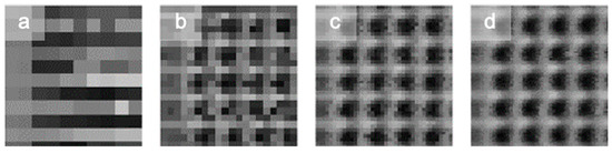 The effect of the step size on the image reconstruction with this setup can be observed in Figure 3 and Figure 4. Figure 3 presents several images of an 800 nm square pattern array taken in steps of 750 nm (Figure 3a), 400 nm (Figure 3b), 200 nm (Figure 3c), and 100 nm (Figure 3d) with the objective of x60 with an NA of 0.85. Figure 3a shows that, when the step used was near the size of the diffracted spot, the structures could be estimated but not resolved. The starting position of the scan influenced the reconstruction of the image, as it determines whether light intensity is captured just above each square or in the separation between the two. In this case, the size of the LED was equal to the size of the pitch used. However, for a pitch smaller than or equal to the size of the virtual LED, the images were resolved with more clarity (Figure 3b–d), i.e., the measurement was oversampled, which allowed us to improve the acquisition of the STOM image.