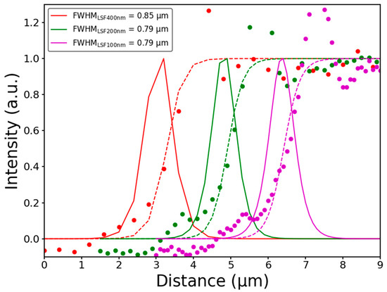 Figure 4 shows the corresponding edge spread function (ESF) and line spread function (LSF) [48]. The ESF is the contrast profile across an edge in the image, and the LSF is its derivative. In the images obtained, both were calculated at one edge of a square in the pattern in Figure 3. The resolution can be calculated from both ESF and LSF. This corresponds to the distance between 10% and 90% of the ESF. On the other hand, this can also be evaluated as the FWHM of the LSF. The ESF data were normalized and averaged (dashed lines) to obtain a uniform LSF (solid lines). As can be observed from the data in Figure 4, the resolution was not affected by the step size, although oversampling produced visually improved images. For all step sizes, the resolution of all of them was maintained at around 800 nm, i.e., around the spot size.