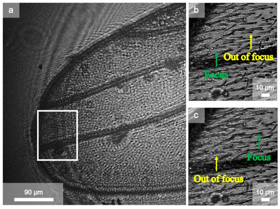 The final experiments demonstrated the capabilities of the technique for biological microscopy. Figure 5a shows the raw view of a scanned fly wing in the camera. Figure 5b,c show STOM images with the objective of x60 with an NA of 0.85 and a step size of 300 nm. As shown in Figure 5b, regions of the sample were out of focus while others were perfectly focused. Nevertheless, as the focus could be controlled by placing the sample at different heights, it could be refocused, as shown in Figure 5c.