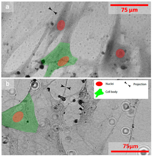 In addition, a second sample, composed of a human lung fibroblast, was explored. Figure 6a shows the raw image, recorded with a Zeiss Confocal Laser Scanning Microscope (CLSM) with a pixel resolution of 0.79 µm, which is similar to that of our optical demagnification STOM microscope. A STOM image, with the objective of x60, an NA of 0.85, and a step size of 600 nm of the same set of cells, is presented in Figure 6b. Both the nuclei and the cell bodies, as well as the sample projections, were very similar in size and structure in both images. Therefore, it was possible to analyze the state of the cells thanks to the fact that the nuclei, i.e., the center of mass of the cell, could be identified despite the lower contrast of the STOM image. The two images do not correspond exactly to the same region because, once the sample is scanned, it is dried. Therefore, the images were obtained with different sets of cells that were part of the same cell culture.