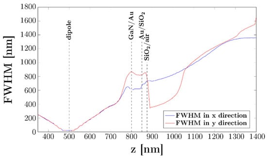 Full-width at half-maximum as a function of the vertical coordinate z. Dashed lines indicate the material interfaces inside the LED structure. The p-GaN layer’s thickness is equal to 300 nm.