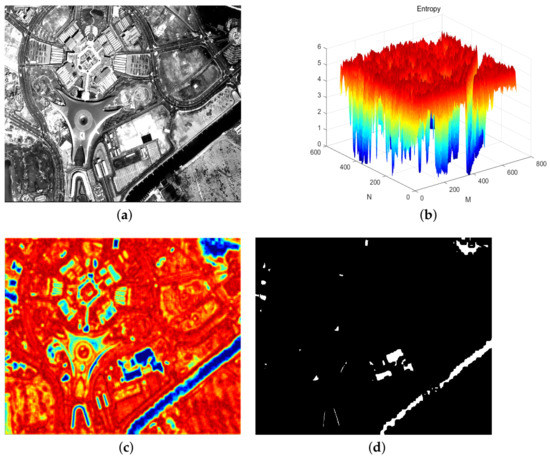 (a) Original image; (b) three-dimensional view of entropy matrix; (c) top view of entropy matrix; (d) segmentation of saturated regions.