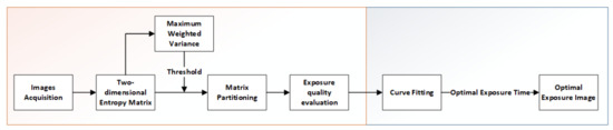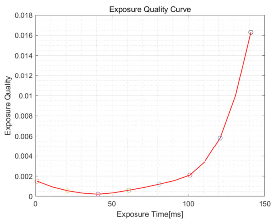The overall architecture of the algorithm in this paper is shown in Figure 2. The method consists of two modules: exposure quality evaluation module and exposure curve fitting module. First, is supposed as the exposure time step to acquire multiple images; then, the exposure quality of the collected images is calculated; then, we perform curve fitting on the exposure quality of these images; finally, the optimal exposure time is acquired according to the fitted curve.