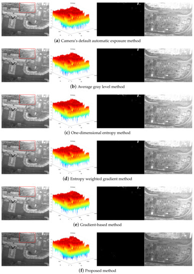 Figure 3 shows that the default automatic exposure algorithm of the camera is similar to the average gray level method, which has certain advantages in the overall brightness of the image, but the overexposed area in the image is not effectively limited. The one-dimensional entropy method pays attention to the overall information of the image. The result of the gradient-based method is consistent with the one-dimensional entropy method, the contrast of the image is relatively strong, but the overexposure phenomenon also exists. The entropy weighted gradient method comprehensively considers the amount of information and edge details of the image, which makes overexposure and underexposure of the image suppressed to a certain extent, but information loss in some areas is still unavoidable. The optimal exposure image obtained by the proposed algorithm has a weaker contrast, but the blue part of the entropy matrix is the least. In other words, the overexposure and underexposure areas in the entire image are minimized so that the image details are preserved to the maximum extent.