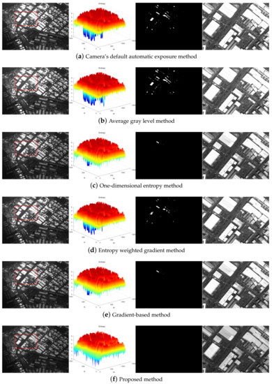 Recently, Kim et al. proposed a new exposure quality evaluation method, of which the entropy weighted gradient of the image was used as an image quality evaluation index [20,21]. They used the index to obtain the optimal exposure time of the camera. The entropy matrix partitioning threshold is a fixed value in this method because of the small shooting area with a large target, and it has a better shooting effect on scenes with less detail. Remote sensing images are rich in details, and the target is usually only a few pixels in size which can lead to massive loss in image details. Each of these methods has advantages and disadvantages.