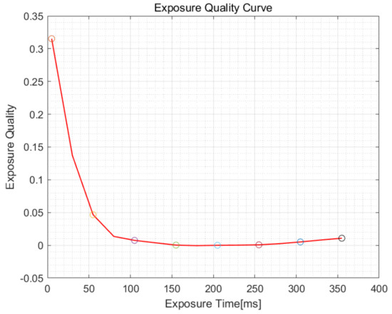In order to further improve the exposure accuracy and improve the exposure quality, we fit the S value of the images obtained by the proposed algorithm to a curve, and sample it with = 25 ms. The resulting curve is shown in Figure 6.