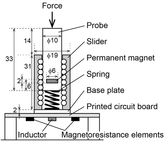 In this study, we propose a novel magnetic food texture sensor that corresponds to the tactile sense of the human tooth. We developed a magnetic food texture sensor that imitated the structure of part of the tooth [19]. A urethane elastomer within the sensor was adopted as the periodontal ligament beneath the tooth. However, the elastomer had low repetitive durability. Therefore, we redesigned it to have higher durability. The new sensor primarily consists of a probe, linear slider, spring, and circuit board. The probe is cylindrical in shape and includes a permanent magnet. Both sides of the spring are fixed to the probe and circuit board. The linear slider enables the smooth, one-axis motion of the probe during food compression. Two magnetoresistive (MR) elements and one inductor on the circuit board were used to measure the probe’s motion. The usage of the MR element and inductor is based on the report that the periodontal ligament, which is under human and animal teeth, has two types of mechanoreceptors with different response characteristics [20]. The slowly adapting type has a function to produce sustained responses to static stimulation by force. The rapidly adapting type produces transient responses to the onset and offset of stimulation by vibration. The MR elements and the inductor in the texture sensor have roles of slowly adapting and rapidly adapting, respectively. With respect to sensors using a magnet, various tactile sensors were proposed [21,22,23]. They focused on the softness of robotic skin and used soft materials as a probe or surface layer. One of their advantages was a wireless structure between the deformation part and measurement part by using the magnet. The texture sensor in this study has a common advantage of the wireless structure and has a structural difference using the probe made from hard material, the linear slider, and the spring. In the following section, the structure and calibration method of the sensor are described. Fundamental experiments were performed to evaluate the sensor’s range, resolution, repetitive durability, and frequency response. Moreover, the sensor is used to measure seven types of chicken nuggets with different coatings. The difference between the force and vibration measurement data is then revealed based on the discrimination rate of these.