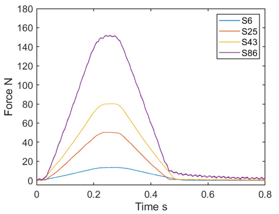 We performed experiments in order to check the texture sensor’s force range. In one experiment, the motorized slider pushed the probe against an acrylic plate suitably placed on the measurement system. As the distance pushed from the contact state of the probe was 2 mm, this corresponds to a displacement of the probe by 2 mm. After this displacement, the motorized slider moved the texture sensor upwards until it was separated from the plate. The texture sensor then measured the force during the motorized slider’s motion. Figure 5 shows the force measured by the texture sensors, from S6 to S86. The vertical axis represents the force calculated using the calibration formula, whereas the horizontal axis represents the time. It took about 0.5 s from the start of pushing until the probe separated from the plate. The maximum forces of each texture sensor were reached at about 0.25 s, at which point the forces were about twice the spring constant. After separating from the plate, S86 gradually approached 0 N, which indicates that it takes time for the spring to return to its natural length. Therefore, this result reveals that the response characteristics of S86 are not good. On the other hand, the other three sensors returned to 0 N at 0.5 s.