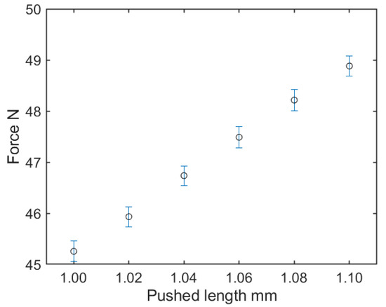 As in the previous section, the texture sensor’s probe was pushed against the acrylic plate by the motorized slider. Initially, the texture sensor was pushed 1 mm from its contact state with the plate and force measured for 1 s. Then, additional pushes of 0.02 mm were made and measured for 1 s a further five times. As a typical result, the relationship between the pushed length of S43 and the force is displayed in Figure 6. Based on the measured force, the mean and standard deviation of the force at each pushed length, and the mean of the differences in force caused by the 0.02 mm displacement of the probe, were calculated. The results are summarized in Table 4. According to Figure 6, the force linearly changed with the 0.02 mm displacement. Moreover, the error bars of adjacent forces did not overlap, and this tendency was the same for other sensors with different spring constants. With respect to the mean of the force differences induced by the 0.02 mm displacement of the probe shown in Table 4, it was observed that the larger the spring constant, the larger the mean. However, the means of force difference of each texture sensor were smaller than twice their standard deviations. This indicated that the resolution of the texture sensor was smaller than the force difference caused by the 0.02 mm displacement of the probe, which was less than 1% of the force range assumed in Section 2.1.3.