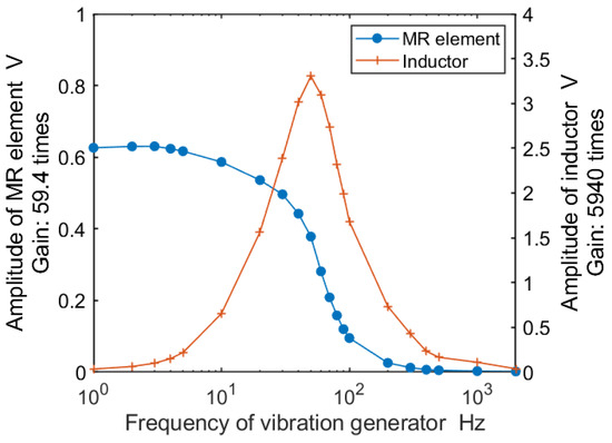 Relationship between the frequency and amplitude in terms of the voltage of the MR element and inductor in the vibration range from 1–2000 Hz.