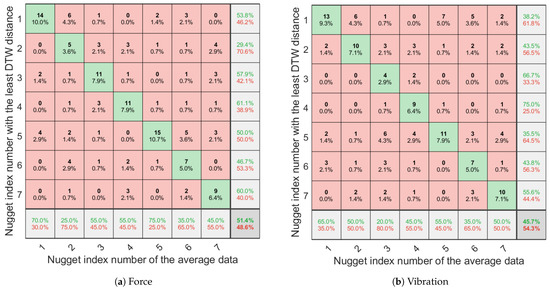 Confusion matrixes of force and vibration. The numbers and percentages were calculated for when the DTW distance in the average data for nuggets with the same coating was least compared to the DTW distances for the average data of other nuggets with different coatings. The green number indicates the percentage which the nugget index number with the least DTW distance and the nugget index number of the average data matched. The red numbers indicate the percentages that did not match.