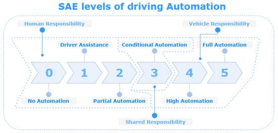 A level of driving automation can be classified using levels defined by SAE International (a standard developing organization specializing in the automotive industry). Using the SAE levels, we can distinguish six levels of automation, which are illustrated in Figure 1. The SAE level 4 and 5 vehicles are high and fully autonomous cars, and they need a perfect understanding of the surrounding environment in real time. SAE is not the only classification that can be used. An early classification, introduced by Sheridan [22], distinguishes ten levels of automation, starting from no assistance, in which the user is responsible for all actions, to complete autonomy of the computer, which ignores human. US Navy Office of Naval Research uses a similar classification, which consists of six levels describing vehicles: human-operated, human-assisted, human-delegated, human-supervised, mixed initiative and fully autonomous [9]. NATO Industrial Advisory Group identified four levels of autonomy based on different industries view on autonomy degree and using the Observe, Orient, Decide, Act (OODA) loop: remotely controlled system, automated system, autonomous non-learning system, and autonomous learning system [9]. Other autonomy assessment scales (multi-dimensional) were introduced by Proud et al. [23] (8 levels of automation with description regarding all stages of the OODA loop per each level), and Clough [24] (11 levels, also described in accordance with OODA loop).